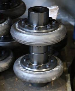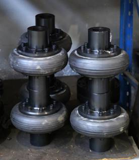裝配時用螺栓與兩半聯(lián)軸器的凸緣連接,依靠擰緊螺栓使輪胎與凸緣端面之間產(chǎn)生的摩擦力來傳遞轉(zhuǎn)矩,輪胎環(huán)工作時發(fā)生扭轉(zhuǎn)剪切變形,故輪胎聯(lián)軸器具有很高的彈性,補償兩軸相對位移的能力較大,并有良好的阻尼,而且結(jié)構(gòu)簡單、不需潤滑、裝拆和維護都比較方便。其缺點是承載能力不高、外形尺寸較大,隨著兩軸相對扭轉(zhuǎn)角的增加使輪胎外形扭歪,軸向尺寸略有減小,將在兩軸上產(chǎn)生較大的附加軸向力,使軸承負(fù)載加大而降低壽命。輪胎聯(lián)軸器高速運轉(zhuǎn)時,輪胎外緣離心力的作用而向外擴張,將進一步增大附加軸向力。為此,在安裝輪胎聯(lián)軸器時應(yīng)采取措施,使輪胎中的應(yīng)力方向與工作時產(chǎn)生的應(yīng)力方向相反,以抵消部分附加軸向力,達(dá)到改善聯(lián)軸器和兩軸承的工和條件